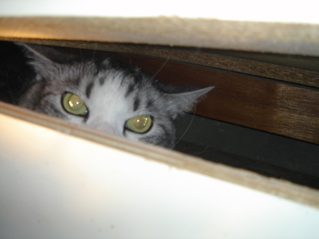 その日、マーロウは段差を利用してラックのいちばん上まで登っていった。しばらく毛繕いをしていたが、ふと「?」という顔つきになった。するとすっと前足と後ろ足と揃えてすっと座り、壁のほうへ目を向けた。
