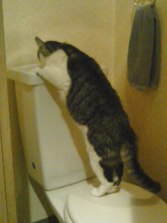 マーロウの水飲み動画。このころ、小でも大でも、私が用を足してトイレから出てくると、待ち構えていたマーロウはトイレに駆け込み、便座の蓋の上に立ち、手洗い用の水をごくごくと飲むという、新鮮だがなんか不潔な気もしなくはない水分補給の習慣があった。